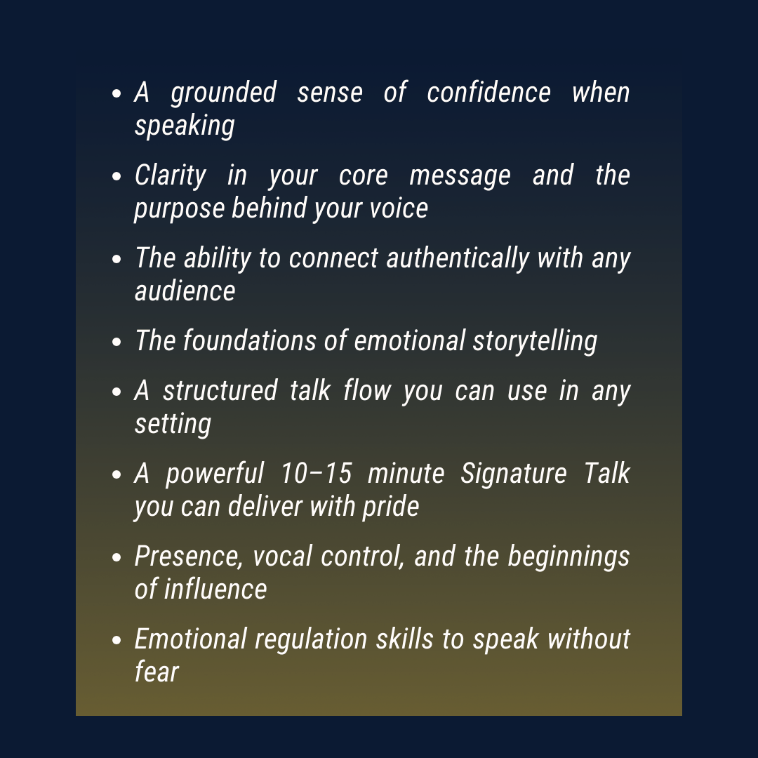 From Awakening Your Voice → To Mastering the Stage → To Inspiring Action at Scale.