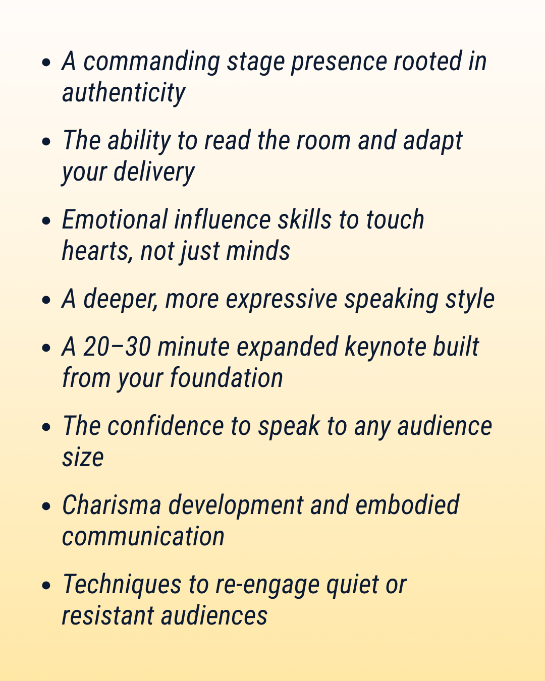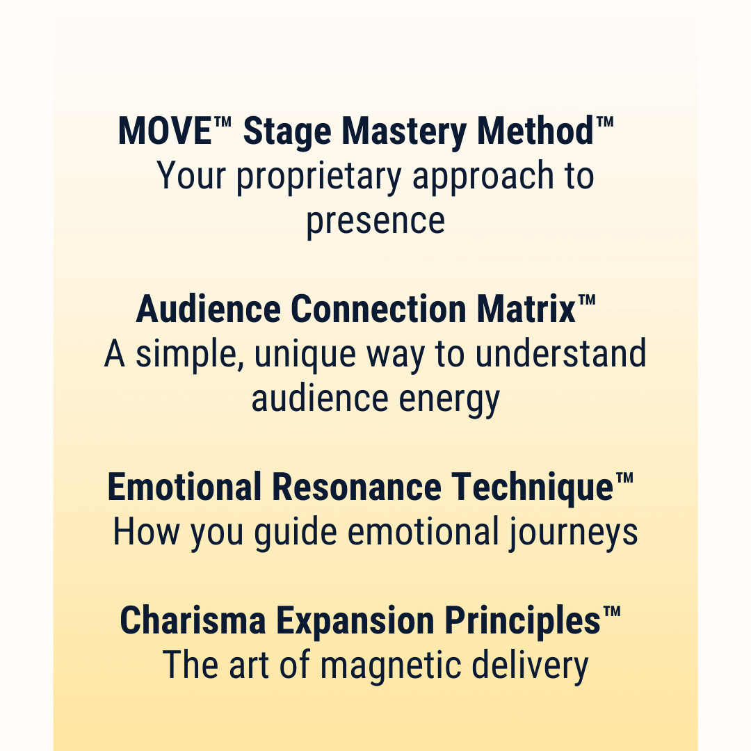Through the MOVE™ Stage Mastery Method™, Audience Connection Matrix™, and Emotional Resonance Technique™, this program elevates your presence to a new level.