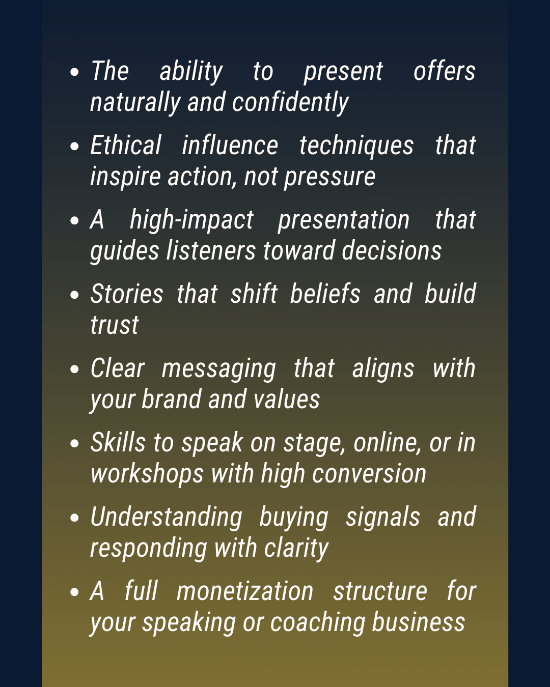 Influence to Sell™ is the master-level training for speakers, coaches, leaders, and entrepreneurs who want to use their voice to inspire action ethically and confidently.