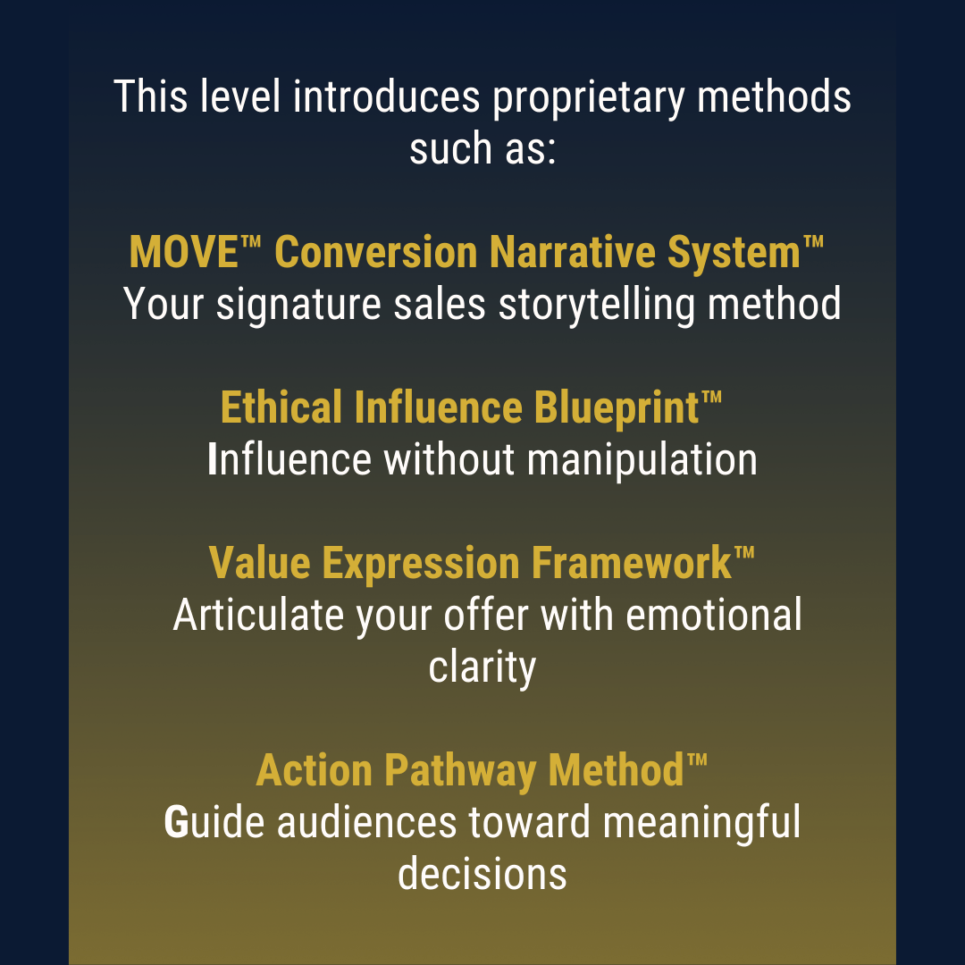 Using the MOVE™ Conversion Narrative System™, Value Expression Framework™, and Ethical Influence Blueprint™, this program teaches you how to communicate your value effortlessly without sounding “salesy.”